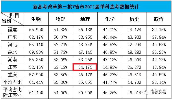 實行新高考改革方案的部分省市2021屆學生各科選考數據,其中江蘇省最受歡迎的科目是地理,并且占比超過80%。