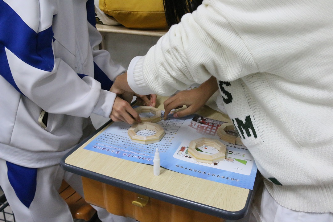 看似沒有什么制作難度的轆轤井,在實際操作中還是有不少同學被難到了。比如八邊形的木塊用膠水粘連在一起后,由于膠水還未干透導致木塊無法緊緊粘住,當在制作其他部件的過程中不小心碰到了其中一塊木塊,整個八邊形就會散掉,于是同學們又得重新涂上膠水對木塊進行粘連。