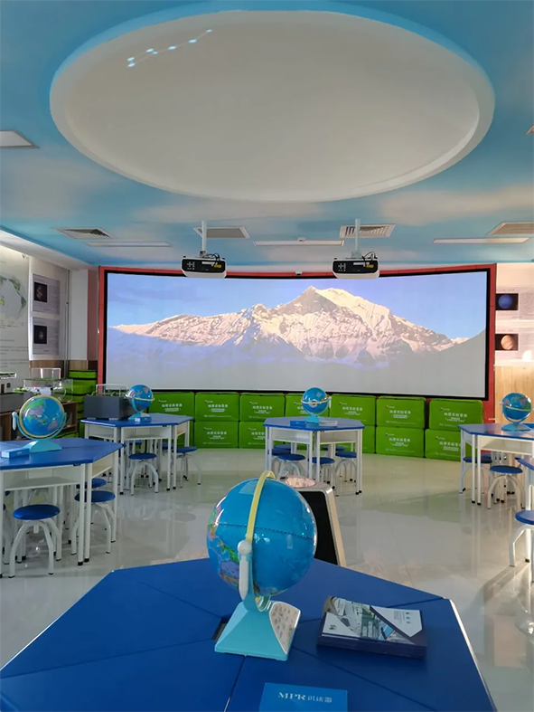 環幕示教系統位于教室后方,專用于地理視頻資源的播放。巨大的屏幕帶來震撼的視覺沖擊,直觀地展示事物發展的動態過程,讓課程內容變得更生動有趣。視頻課件對課程的導入、過渡作用,使課程進行得更自然順暢。