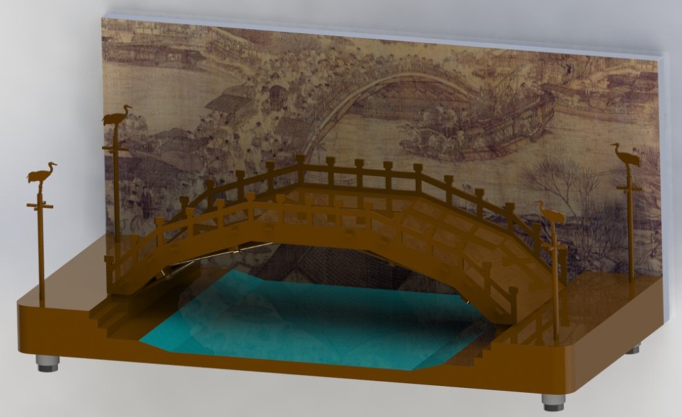 《清明上河圖》整幅長卷創作于十二世紀初的中國,圖卷通過全景式構圖,描繪出北宋都城汴梁繁華綺麗的景象。而汴京的自然風貌與人文景觀尤以汴水虹橋,及虹橋兩堍對立著的四個華表為中軸鋪展而來。我司產品編木拱橋演示模型旨在深刻透析作為《清明上河圖》全卷中心的虹橋——編木拱橋基礎上,幫助學生整體把握北宋時代的精神風貌,并進而協助教師培育學生實踐操作能力與歷史交互思維。
