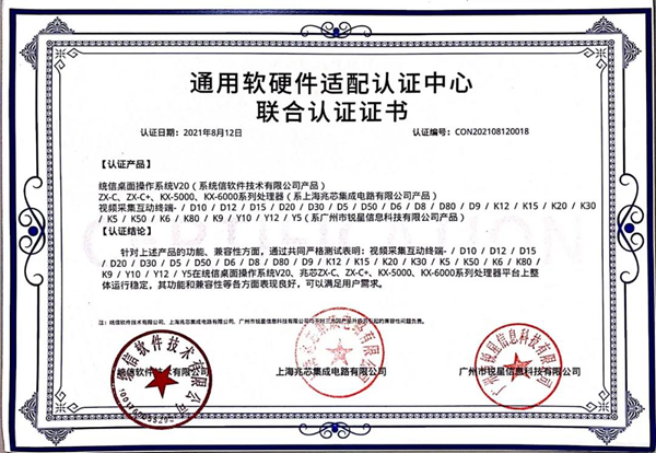 兆芯認證證書(無線視頻展臺、視頻采集互動終端)