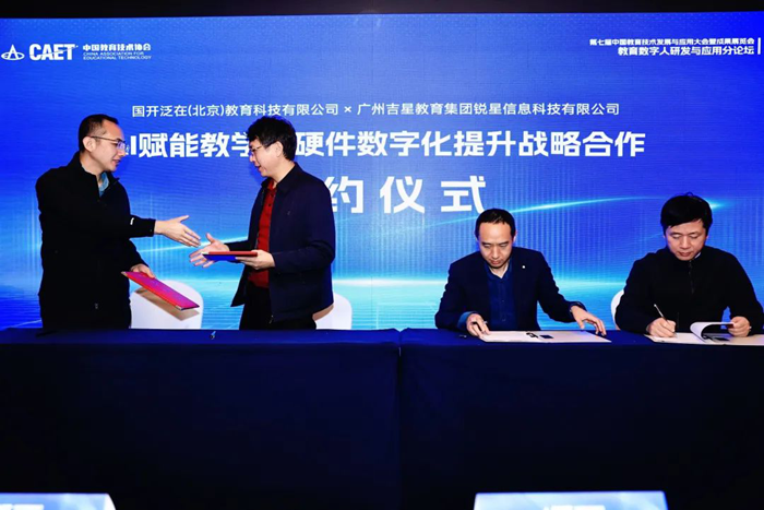 在“AI賦能實驗教學軟硬件數字化提升戰略合作環節”,廣州吉星與國開泛在(北京)教育科技有限公司簽訂戰略合作協議。