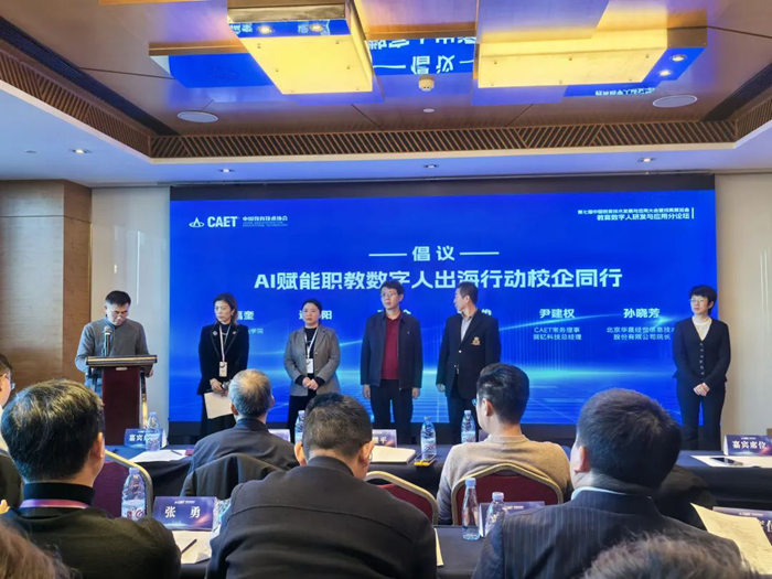 在“AI賦能職教數字人出海行動校企同行”環節中,吉星科技董事長舒華俊作為中國教育技術協會常務理事的身份亮相,與重慶三峽職院趙福奎副校長、鄭州西亞斯學院逯陽副校長、四川長江職院張會副院長、潤釔科技尹建權總經理、華晟經世孫曉芳院長同臺倡議共同倡議職教數字人出海,推動職業教育數字化進程。