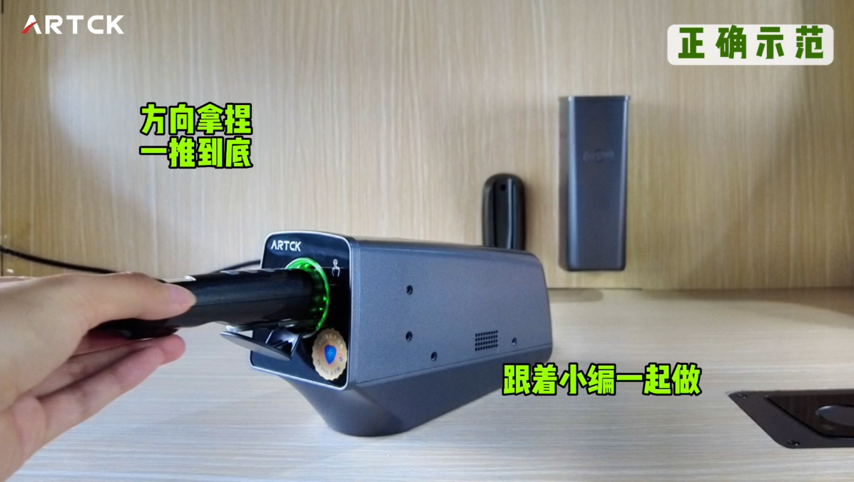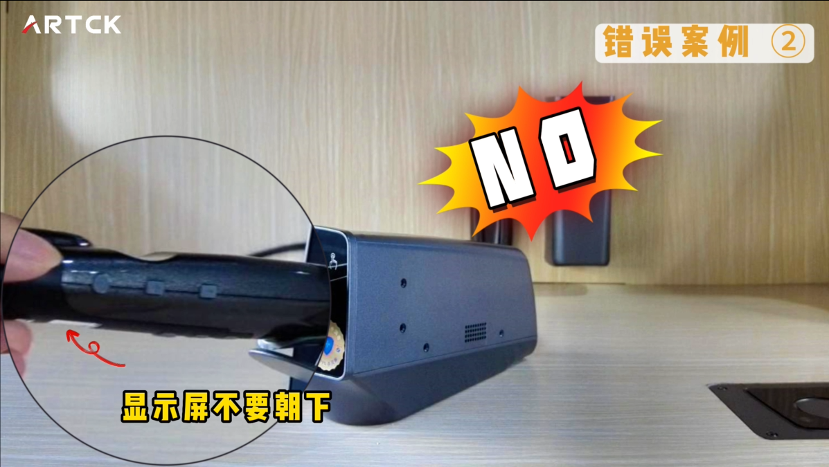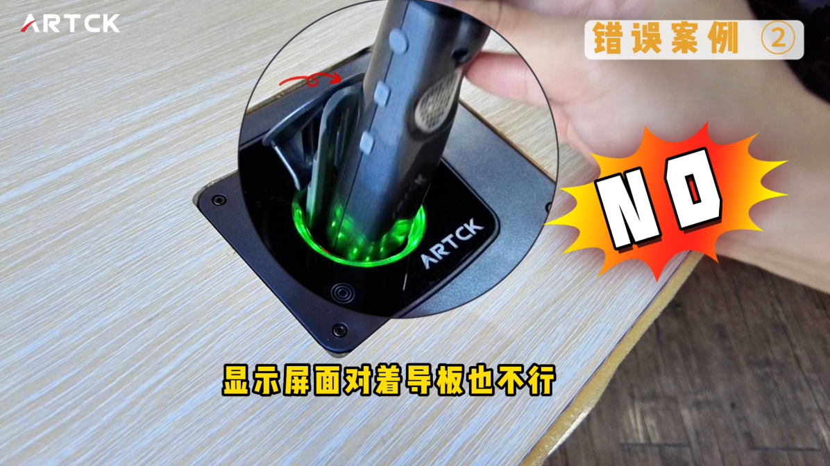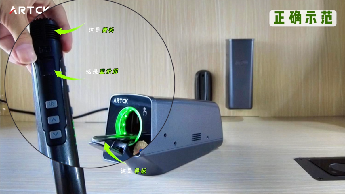 顯示屏背對導板,麥頭朝上,松手即可;