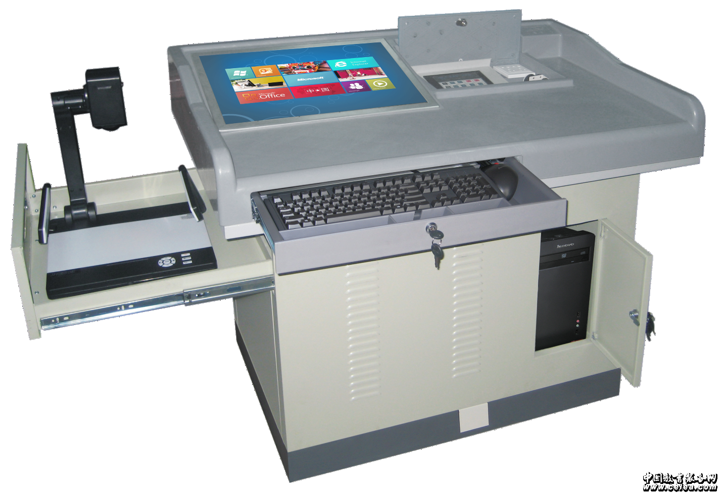 產品詳細介紹1、講臺整體采用分體式結構,長1150mm、寬650mm、高880-970mm;上箱體為1150x650x190mm,下箱體為920x540x680mm。 2、上體臺面、鍵盤托、中控蓋板及下體前后板選用一次注塑成型(壁厚大于或等于4MM)的ABS工程塑料材質,整個臺面無金屬板材;下體左右側開門,柜門采用1.0mm-1.5mm優質冷軋鋼板。 3、左側有放置標準展示儀的抽屜,承載大于10公斤。 4、底座采用塑料底座、利于防水、防潮。 5、上箱體顏色為啞光灰白色(也可由學校個性化選擇),采用立體飾紋的表面;下箱體顏色采用電腦灰(也可由學校個性化選擇)。 6、采用前置隱藏式結構,可容納長530mm×寬205mm以下的鍵盤,鍵盤盒內功能分區鮮明,前面可放置白板筆,右側可放置鼠標,操作簡單方便實用。 7、上箱體左邊為顯示器固定框,可容納17-22寸不同規格液晶,讓使用者有更好的選擇;顯示器窗口上嵌式安裝5MM厚鋼化玻璃,右側有功能合:臺面功能盒內可安放中控(最大開孔235mm*140mm)、展示儀、標準電源插座,并切有各自獨立的標準安放位置不能重疊,方便使用;中控放置位有10°的斜角,方便操作。 8、滑板、抽屜均選用高強度靜音導軌,鎖扣等都采用高品質產品,堅固、耐用。 9、全部的加工件均須保障尺寸精度及各部件一致性 10、全封閉結構,安全防盜,鎖好講桌后,桌外無任何可拆卸部件 11、整體造型設計以人為本,符合人機工程學要求,提供樣品(或提供臺面塑料截面 ) 12、提供塑鋼講臺外觀專利或專利受理書。