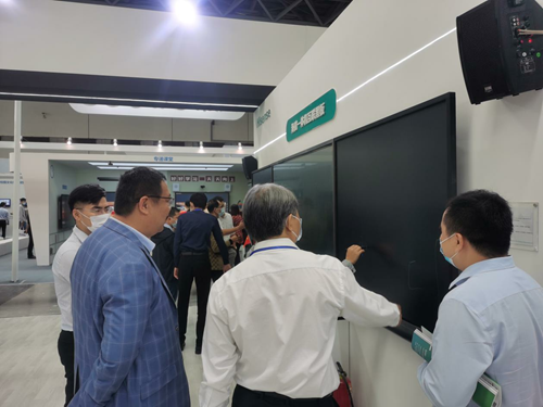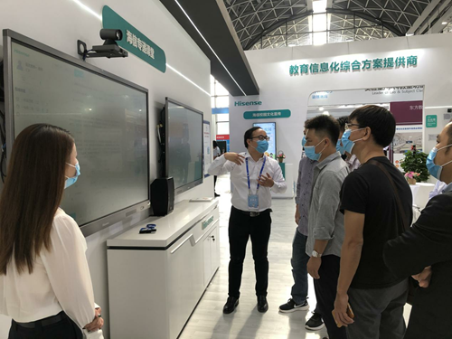 在展會(huì)現(xiàn)場(chǎng),海信交互式觸控一體機(jī)+VR打造虛擬仿真實(shí)驗(yàn)平臺(tái)、海信智慧課堂解決方案、海信智慧物聯(lián)教室、校園集控管理、多媒體信息發(fā)布平臺(tái)等吸引人眾人圍觀。