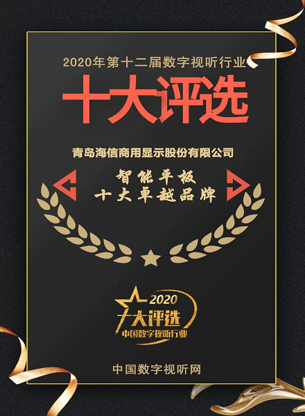 喜報!海信商用顯示榮獲“智能平板十大卓越品牌”!
