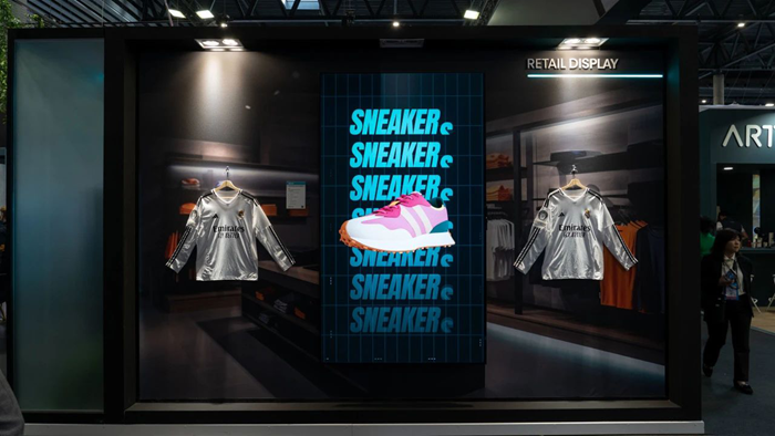 現場,一個疊拼標牌墻吸引了眾人駐足圍觀。該方案采用55英寸海信DM66D系列數字標牌產品+海信自研VisionInfo信發智控軟件,將6塊標牌錯落排列,實現內容無縫拼接。值得一提的是,DM系列憑借卓越性能,于2024年榮獲ISE展會“Best of Show 2024”大獎。該系列產品覆蓋32-100吋全尺寸段,滿足多樣化展示需求;具備500nits高亮、25%高霧面抗反光、支持7*24小時全天候工況、橫豎放、全系列能源之星認證節能環保,可實現公共信息展示、廣告播放、菜單選餐、信發集控,提供智慧零售和QSR場景解決方案。
