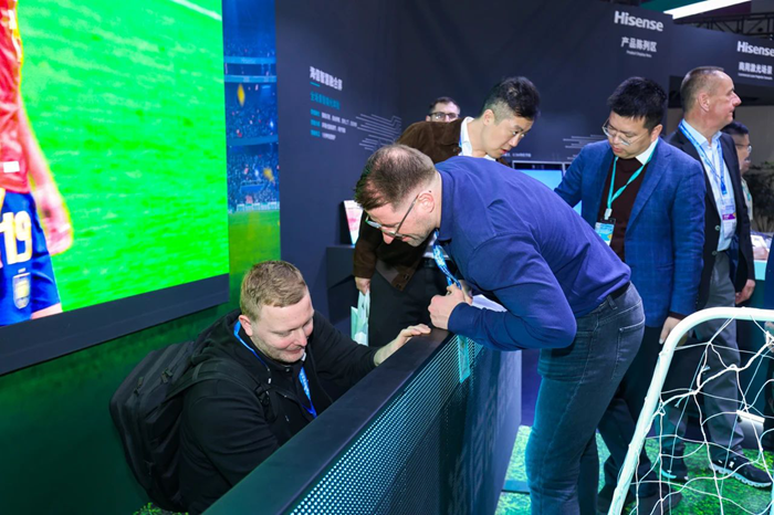 體育場場景則是還原了線下體育觀賽,通過“LED氛圍屏+SP系列圍欄屏”組合的方式,打造身臨其境的觀賽體驗。作為世界杯、歐洲杯等多屆世界大型體育賽事的贊助商,海信LED產(chǎn)品在全球多個大型專業(yè)足球場落地,為球迷打造更加沉浸式的觀賽體驗。另外,觀眾們還可近距離體驗海信多款小間距LED顯示屏,感受海信LED豐富的產(chǎn)品矩陣。