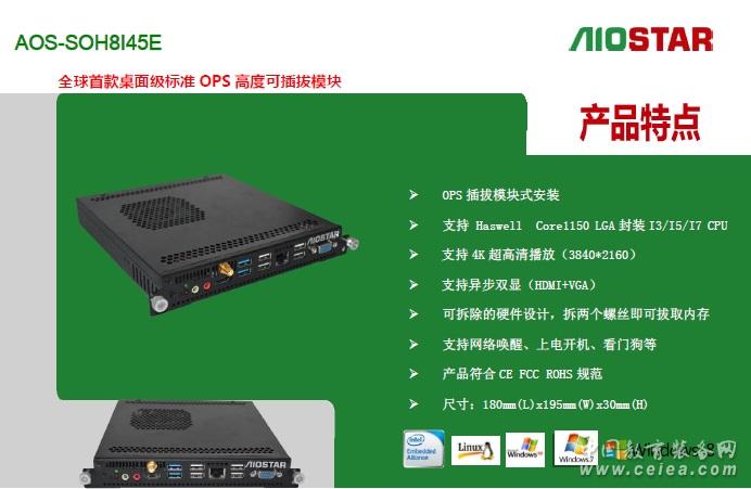 應用領域 適用于教育,餐廳,酒店,商場,公司會議,政務公開等領域。 1概述編輯 Aiostar OPS 全稱為:Aiostar Open Pluggable Specification,開放式可插拔規范。是Intel與顯示器廠商共同制定的標準化數字標牌接口規范。OPS內部組成是一個X86架構的迷你PC,采用英特爾酷睿處理器,配有內存、硬盤、多種輸入輸出接口以及Windows操作界面,尺寸為200mm x 119mm x 30mm 。 以下為Intel 官網對于OPS的定義: 原文如下: Digital Signage Open Pluggable Specification :Simplify digital signage development Highlights Enables easier installation, use and maintenance of digital signs. Makes digital signage devices more intelligent and connected. Overview The open pluggable specification (OPS) helps standardize the design and development of digital signage devices and pluggable media players. Intel created OPS to address digital signage market fragmentation and simplify device installation, usage, maintenance and upgrades. OPS enables digital signage manufacturers to deploy interchangeable systems faster and in higher volumes, while lowering costs for development and implementation. Installing digital signage equipment based on Intel architecture helps you implement scalable digital signage applications that can network easily with other equipment. This simplifies interoperability and application upgrades designed to meet the digital signage requirements of individual customers, while helping to future-proof technology investments.[1] 譯文: 強調 更便于安裝、使用和維護的數字信號。 使數字看板設備更智能和融合。 概述 開放的可插拔的規范(OPS)有助于規范的設計和開發數字看板設備,并插入媒體播放器終端。Intel創造OPS 致力于數字看板市場分化和簡化設備安裝、使用、維護和升級。 OPS可以使數字看板制造商更快部署大量的交互系統,同時降低開發和實現的成本。 安裝基于英特爾架構的數字標牌設備可以幫助您實現可伸縮的數字看板應用程序,并且很容易和其他設備進行網絡連接。這簡化了通過交互和升級的設計來滿足個人客戶的數字看板需求,同時有利于面向未來的技術投資。 2特點編輯 1、支持數字標牌等行業最新的OPS規范的電腦模塊,加速數字標牌行業的標準化趨勢。 2、OPS模塊可以簡化設備的安裝、使用、維護和更新,幫助數字標牌制造商降低開發和實施成本。 3、OPS可簡便地與其它設備聯網,可擴展數字標牌應用,滿足數字標牌對交互和應用更新的需求。 4、部分OPS平臺支持遠程管理及低功耗模式,解決耗電及散熱要求。同時平臺所支持的Intel vPro、AMT遠程管理技術,實現設備無人操控下的高效運作。如采用四代i5+Q87平臺的AOS-SOQ8I45A 5、OPS無風扇散熱設計,提供超靜音的解決方案,保證工作環境的安靜、清爽。發熱量小也帶來了較小的功耗。 3整機編輯 Intel 2011年提出該規范后,伴隨著日本NEC OPS接口顯示器的上市,傳統數字標牌嵌入式主板走下神壇,OPS模塊化正式開啟。代表作品有 愛鑫微電子(AIOSTAR) AOS-SOH8I45A ,