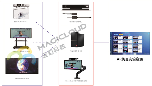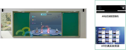 因此,實驗平臺系統(tǒng)的搭建非常便利,需要做的只是選擇一間常規(guī)多媒體教室或功能教室(教學(xué)場地),現(xiàn)有教學(xué)設(shè)施(或新建)包括一臺亮度適中的投影機(jī)、幕布或電子白板、教師計算機(jī)、電子講桌、音響等(多媒體設(shè)備),也可以是一臺集成度更好、性價比更高的多媒體教學(xué)觸控一體機(jī)、推拉組合黑板等,然后增加一臺體感追蹤攝像機(jī)、伸縮式支架、AR仿真實驗考試資源及軟件,從而實現(xiàn)多媒體教室的平滑升級。