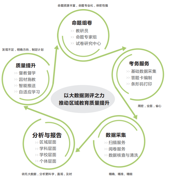 承儒公司聯合各地教科院命題專家與學科骨干教師,共同開展命題研究,并結合大數據和云計算技術推出了從數據命題到質量分析全流程的學業水平考試整體解決方案。旨在協助各地教育局和學校加強對區域的整體教學水平和學生過程性學業表現的監測和調控,有效提升區域和學校整體教學質量。