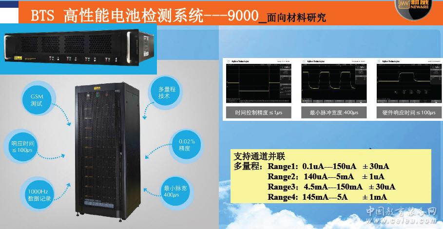 產(chǎn)品詳細(xì)介紹產(chǎn)品簡(jiǎn)介: ① BTS-9000基于NEWARE第6代測(cè)試系統(tǒng)架構(gòu),主要用于電池材料研究、高精度測(cè)試、脈沖充放電測(cè)試、DCIR(直流內(nèi)阻)測(cè)試、Cycle Life測(cè)試。 ②BTS-9000目標(biāo)客戶群體為:各研究機(jī)構(gòu)、高校和電池生產(chǎn)企業(yè)實(shí)驗(yàn)中心。 應(yīng)用領(lǐng)域 項(xiàng)目 應(yīng)用領(lǐng)域 ①高精度測(cè)試: 電壓、電流、容量、能量 ②電池性能測(cè)試: 循環(huán)壽命、過充、過放 ③脈沖測(cè)試: 直流內(nèi)阻(DCIR測(cè)試、HPPC測(cè)試、支持GSM脈沖放電測(cè)試及循環(huán)壽命測(cè)試 ④分選: 電池一致性測(cè)試與評(píng)估 ⑤材料研究: 最小測(cè)試量程到μA級(jí) 技術(shù)指標(biāo) 項(xiàng)目 技術(shù)指標(biāo) ①輸出范圍(可定制): 電壓:0~5V ②分辨率: 16bit ③控制精度: ±0.02% of FS ④測(cè)量精度: ±0.02% of FS ⑤硬件響應(yīng)時(shí)間: 電流(10%~90%)響應(yīng)時(shí)間≦100μs ⑥數(shù)據(jù)記錄: 最高達(dá)1000Hz , 支持△t/△U/△/I作為記錄條件 ⑦支持模式: 充電:CCC,CVC, CC&CVC, CPC, Pulse; 放電:CCD, CVD, CRD, CPD, Pulse ⑧并聯(lián)模式: 支持通道聯(lián) ⑨多量程: Range 1 160μA滿量程 ±32 nA Range 2 50mA滿量程 ±1μA Range 3 160mA滿量程 ±32μA Range 4 5000mA滿量程 ±1mA 威高精度電池檢測(cè)柜分為四大系列: