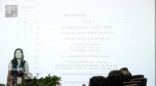 會議伊始,本次活動的發起人,得心私董會的李懿娜女士致開場辭,她首先對得心私董會這些年的努力及成果做了總結,然后給大家展示了私董會2018年全年活動方案及后期私董會發展規劃,內容精彩豐富,其中包括騰訊、亞馬遜等知名企業的訪問合作,到場嘉賓對此表現了濃厚的興趣。
