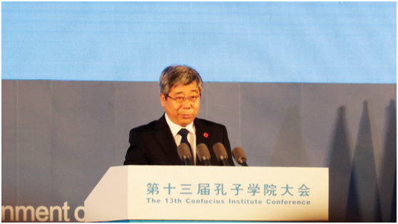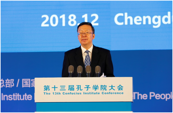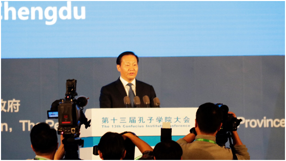 中共四川省省委書記彭清華致辭,他代表省委、省政府向出席大會的各位嘉賓表示歡迎。他說,孔子學院在推動世界各國“民心相通”中發揮著重要作用,越來越成為中外語言文化交流的窗口和橋梁。四川是華夏文明的發源地之一,有文化的基因和興教的傳統。近年來,我省堅持傳承弘揚中華優秀傳統文化,鼓勵支持四川學校在海外建立孔子學院,以學院為“媒”、以語言為“橋”,積極推進教育對外開放,深化與世界各國的交流合作。下一步,我們將一如既往重視支持孔子學院建設,大力推廣漢語言文化,促進各類人才交流交往,推動中國文化、巴蜀文化走出去。