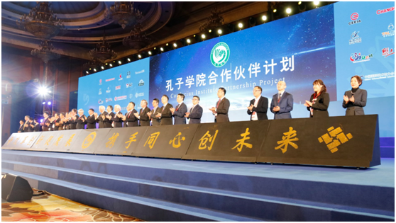 最后,舉行了“孔子學院合作伙伴計劃”啟動儀式,中華人民共和國教育部副部長、孔子學院總部理事會理事田學軍,孔子學院總部副總干事、國家漢辦副主任馬箭飛,以及幾位孔子學院總部理事會理事,攜手中國圖書進出口總公司副總經理林麗穎,中國交通建設股份有限公司海外事業部副總經理施穎陶,北京文香信息技術有限公司副總裁張軼君等企業界代表,共同為合作標語“改革創新促發展,攜手同心創未來”鎏金。
