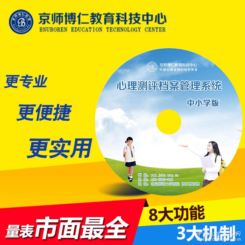產品詳細介紹一、系統簡介 京師博仁心理測評檔案管理系統(中小學版)集人員信息采集、心理測評、危機預警、心理咨詢、心理檔案、問卷調查、心理網站、系統回收站8大功能于一體,并有效形成預防、預警、干預3級防御機制。同時支持單機、局域網、互聯網多種運行模式。 中小學版測查范圍涵蓋心理行為評定、個性氣質測驗、人格測驗、社會適應與人際交往評定、學生心理與行為評定等17類測驗,包含80多個專業測驗。系統可有效幫助教師或學校心理工作者及時有效地發現有心理問題的學生,對問題學生進行一些必要的心理疏導和訓練,從而增強管理教育的針對性。測評結果能幫助教師或學校心理工作者掌握被測學生的心理健康狀態,建立被試心理檔案,篩選出有心理問題或心理狀態較差的學生,是進行相關心理問題干預、心理咨詢與輔助的有效工具。