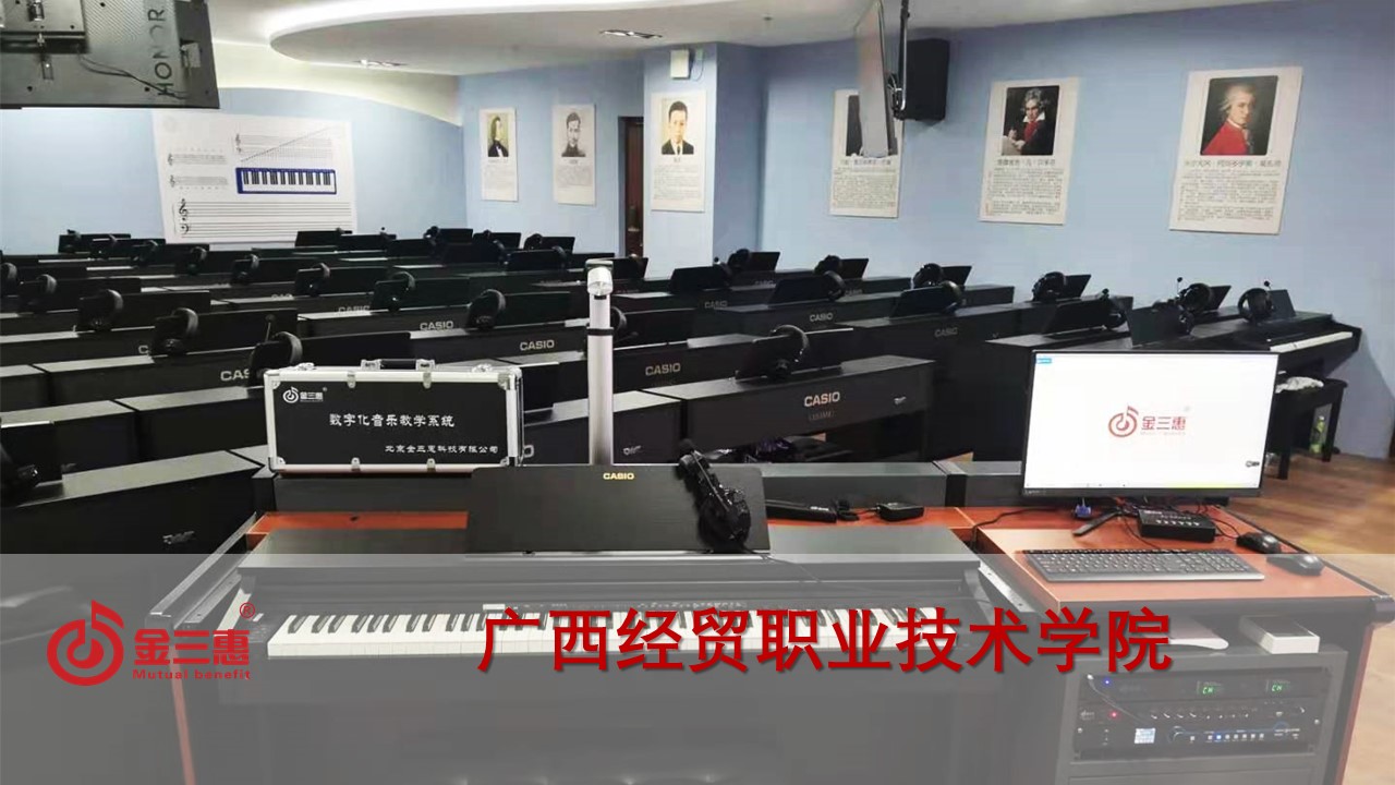 廣西經貿職業技術學院的電鋼琴教室正式開始使用,本校數字化音樂教室由北京金三惠科技有限公司負責提供、安裝、培訓。