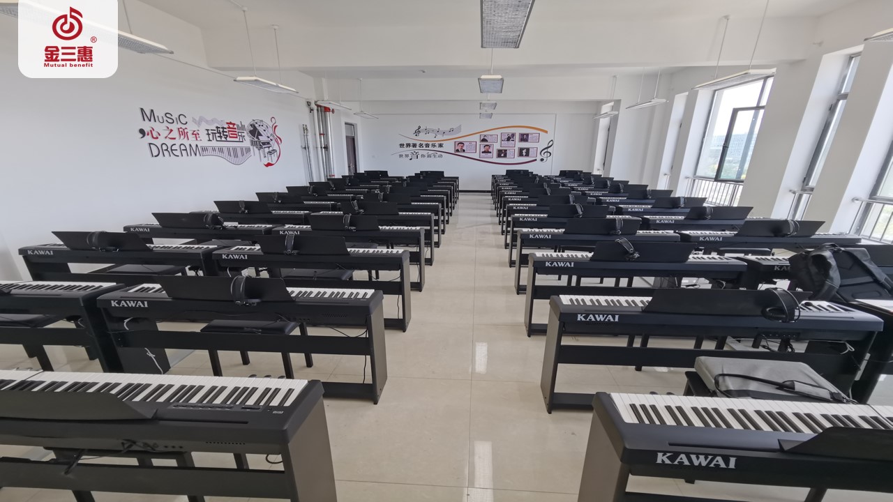 新疆第五師雙河職業技術學校緊跟教育部腳步,攜手北京金三惠科技有限公司為學生提供了50+1的電鋼琴教室,配備了金三惠電鋼琴教學系統、電鋼琴、數字音樂教學儀等教學教具,營造一個享受音樂的天地!