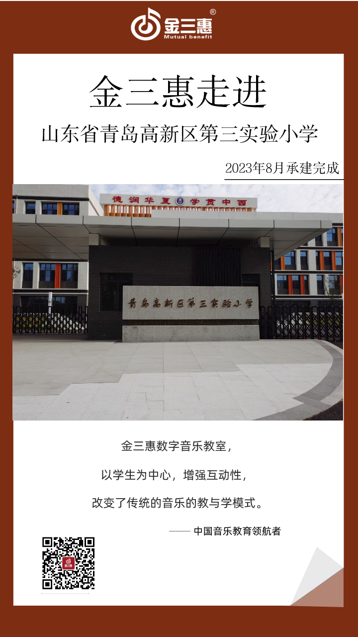 2023年8月,金三惠數字音樂教室為山東省青島高新區第三實驗小學提供、安裝、培訓的23+1智慧創客音樂教室正式開始使用!配備了金三惠教學系統、電鋼琴、數字音樂教學儀等教學教具。