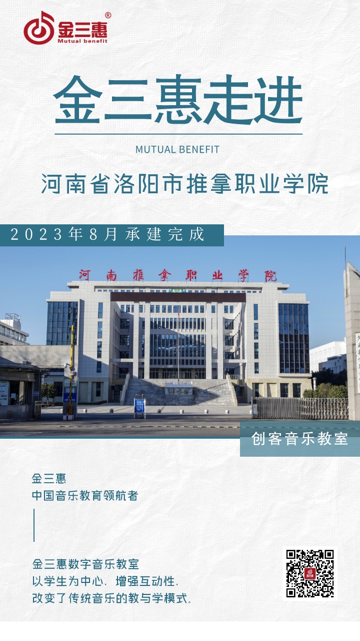 2023年8月,金三惠數字音樂教室為河南省洛陽市推拿職業學院提供、安裝、培訓的40+1智慧創客音樂教室正式開始使用!配備了金三惠教學系統、電鋼琴、數字音樂教學儀等教學教具。