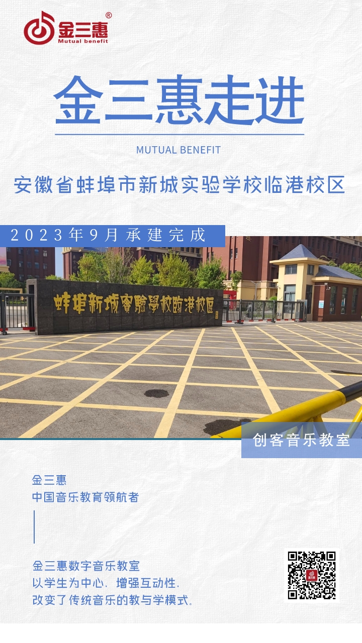 2023年9月,金三惠數(shù)字音樂(lè)教室為安徽省蚌埠市新城實(shí)驗(yàn)學(xué)校臨港校區(qū)提供、安裝、培訓(xùn)的24+1智慧創(chuàng)客音樂(lè)教室正式開(kāi)始使用!配備了金三惠教學(xué)系統(tǒng)、電鋼琴、數(shù)字音樂(lè)教學(xué)儀等教學(xué)教具。