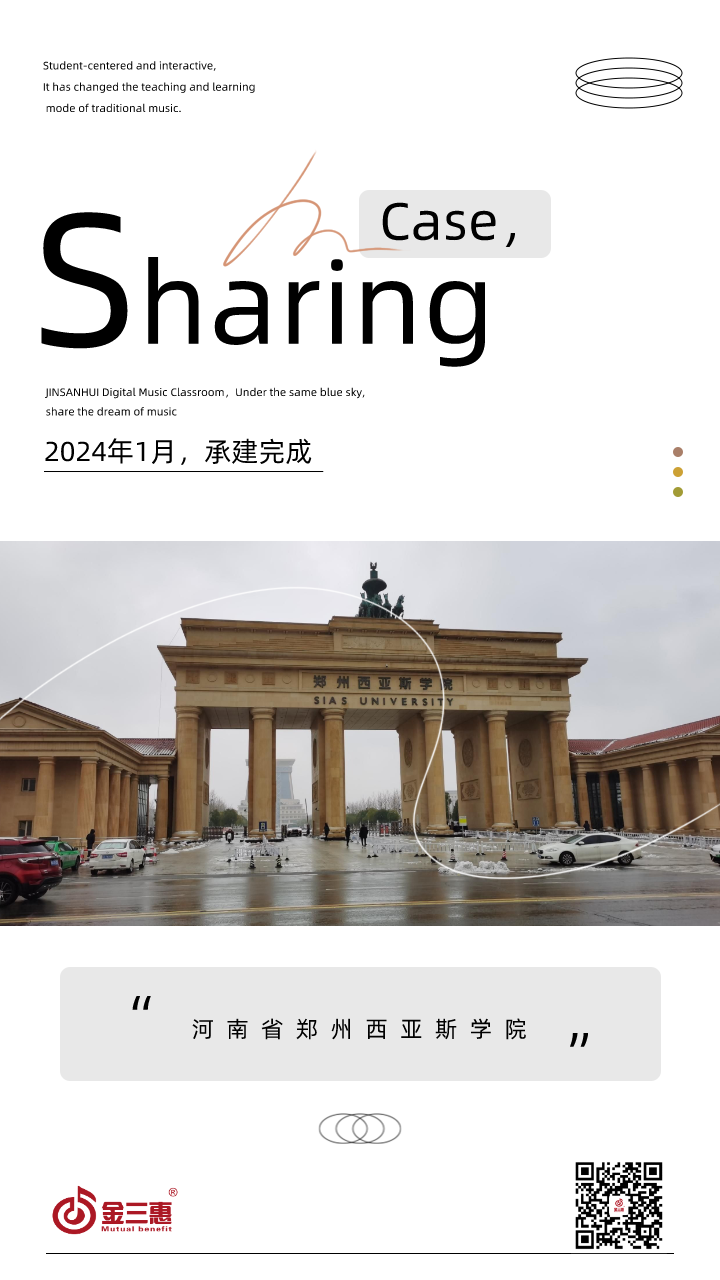 2024年1月,金三惠數字音樂教室走進河南省鄭州西亞斯學院,為學校提供了42+1的電鋼琴教室配備了金三惠電鋼琴教學系統、電鋼琴、數字音樂教學儀等教學教具等。電鋼琴室-金三惠 (jinsanhui.com)