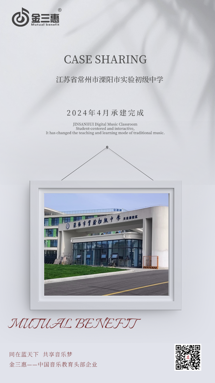 2024年4月,金三惠數字音樂教室走進江蘇省常州市溧陽市實驗初級中學,為學校提供了40+1的電鋼琴教室,配備了金三惠電鋼琴教學系統、電鋼琴、數字音樂教學儀等教學教具等。