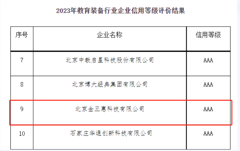 北京金三惠科技有限公司經嚴格評審,獲得2023年中國教育裝備行業AAA企業信用等級證書。