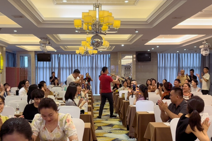 劉美英音樂名師工作室表演了工作室編創(chuàng)的歌曲《迎客歌》,富有了濃郁的民族風味,將培訓場面推向高潮。