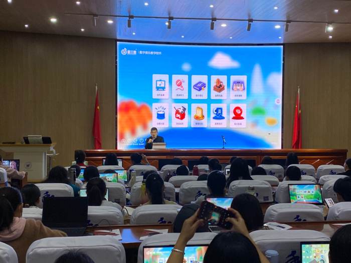 此次培訓由海南省北斗小學鄧丕錦老師主持,陵水縣教研培訓中心藝術教研員劉莎老師指導,北京金三惠教研部主任劉浩然老師主講,為全縣中小學音樂教師帶來了一場理論與實踐相結合的數字化教學培訓。