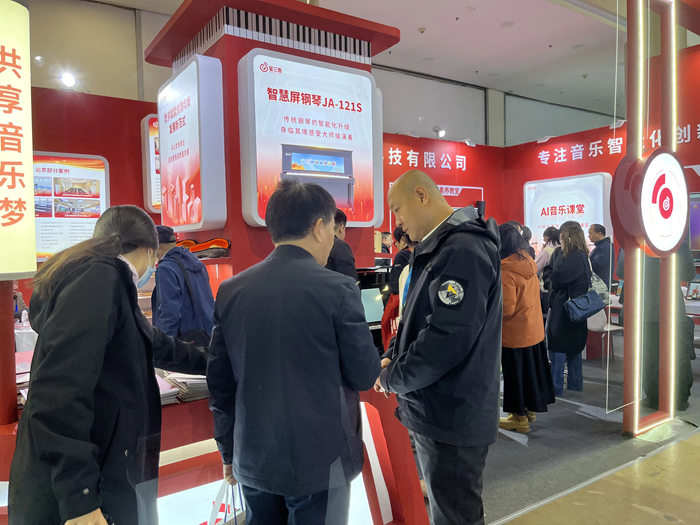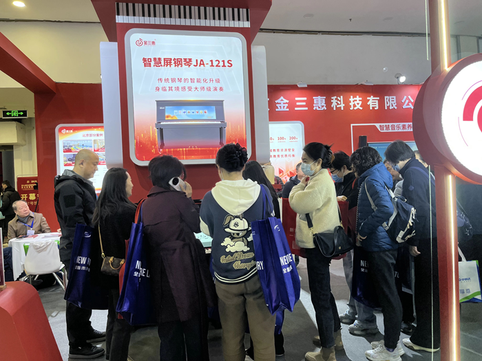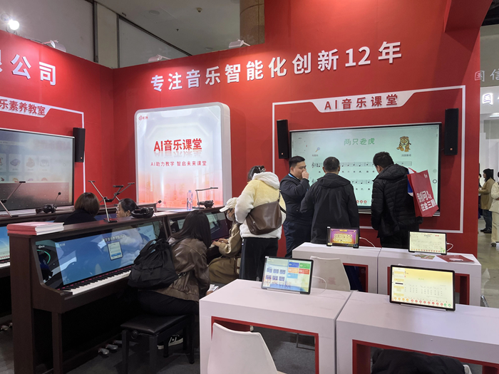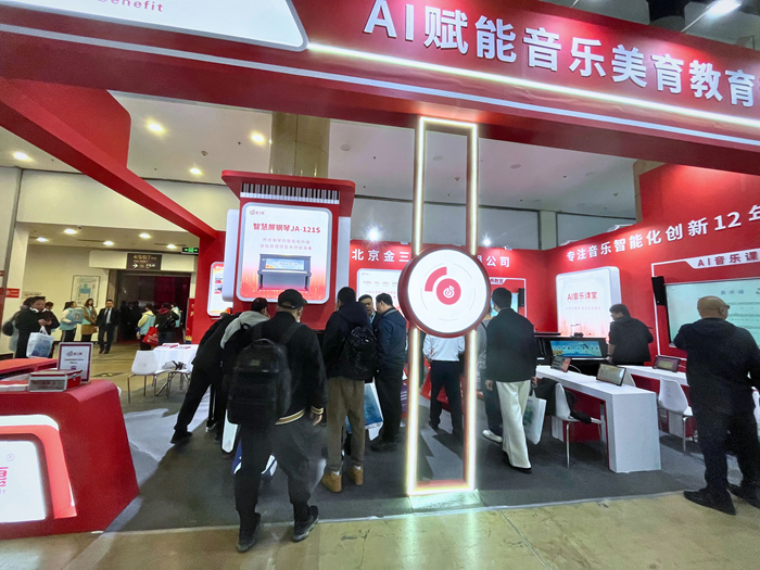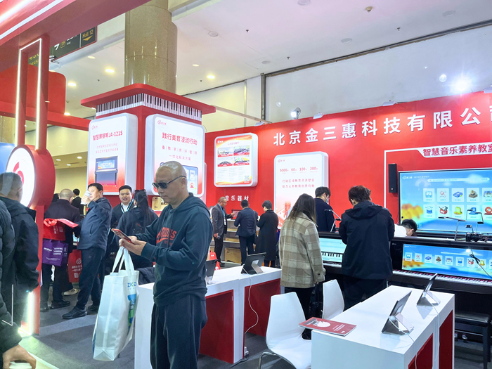展會首日,金三惠展位參觀者絡繹不絕,公司展出的AI音樂課堂、智慧音樂素養教室、數字音樂教學平臺等核心產品,吸引了眾多教育行業從業者的駐足與體驗。