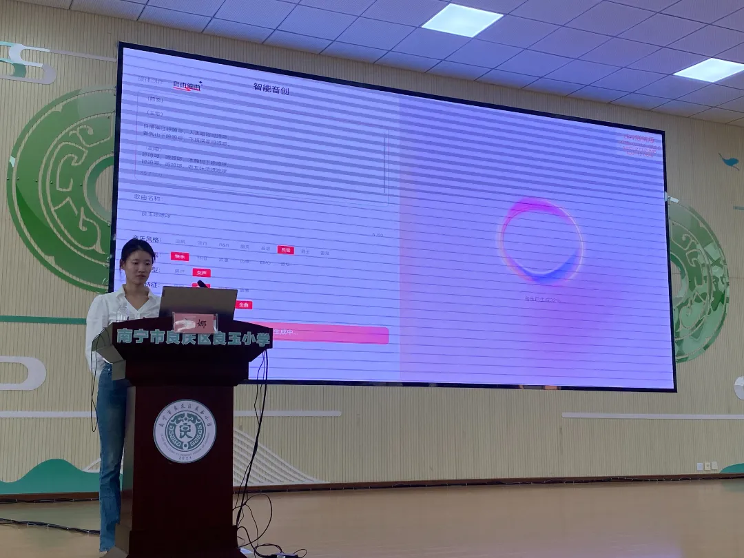金三惠講師為老師們詳細(xì)講解并演示了軟件中的多種AI教學(xué)功能,包括AI測評和AI教唱等,老師們還現(xiàn)場體驗(yàn)了AI智能音創(chuàng)功能,為廣西即將到來的“三月三”節(jié)日和即將盛放的黃風(fēng)鈴花分別創(chuàng)作了兩首風(fēng)格迥異的歌曲,獲得了在場老師們的掌聲與喜愛。