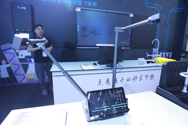 第83屆中國教育裝備展示會上,童園科技理化生智能實驗室、中考實驗操作考評系統、AI評分系統等教育信息化系列產品。