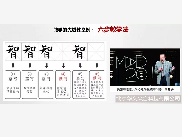 此外,華文眾合數(shù)字書(shū)法教學(xué)系統(tǒng)還采用國(guó)際先進(jìn)的“六步教學(xué)法”進(jìn)行書(shū)法學(xué)習(xí)和練習(xí),教學(xué)效果良好,學(xué)生進(jìn)步明顯。有案例表明,某學(xué)校的學(xué)生在使用“六步教學(xué)法”進(jìn)行一個(gè)學(xué)期的練習(xí)之后,80%能夠脫離臨摹臺(tái)進(jìn)行創(chuàng)作。