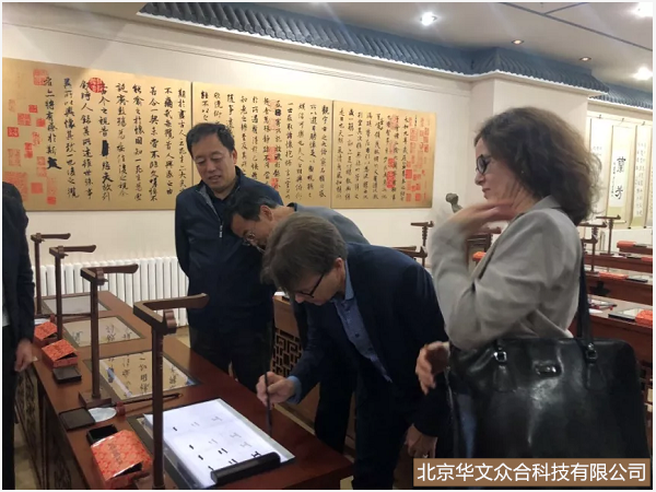 Eranpalo(妮娜·艾安保羅)院長(zhǎng)及訪問(wèn)團(tuán)隨行人員到青島西海岸新區(qū)育才初級(jí)中學(xué)進(jìn)行友好訪問(wèn),參觀并體驗(yàn)學(xué)校由北京華文眾合科技有限公司打造的智慧書法教室。兩位外賓對(duì)書法熱情極高,通過(guò)體驗(yàn),近距離感受了中華民族優(yōu)秀傳統(tǒng)文化。