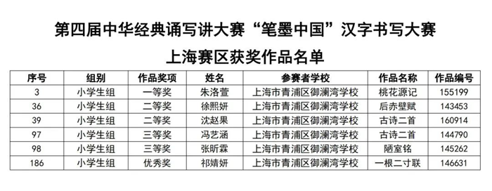 2022年8月,教育部、國家語委主辦的第四屆中華經典誦寫講大賽“筆墨中國”漢字書寫大賽,青浦區御瀾灣學校朱洛萱、徐熙妍、沈趙果、馮藝涵、張昕霖、祁婧妍6位同學嶄露頭角獲得佳績。