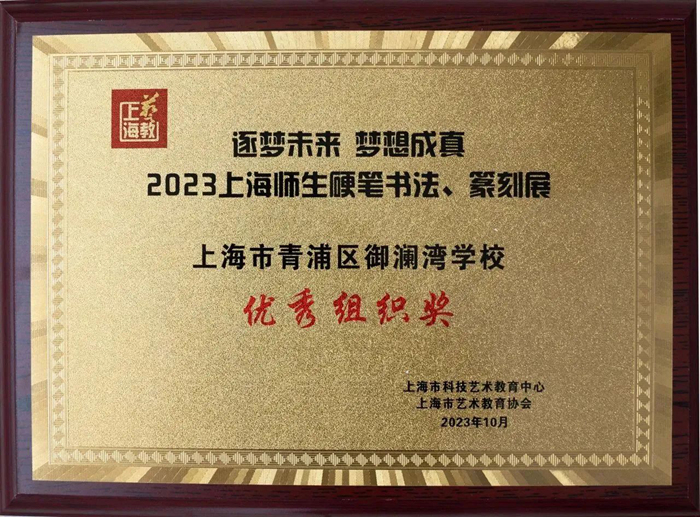 2023年10月29日,“逐夢未來夢想成真”2023上海師生硬筆、書法篆刻作品展,御瀾灣學校多名師生作品脫穎而出,獲得多項獎項并入展本次展覽。學校亦榮獲“優秀組織獎”,并入選首批上海市“硬筆書法進校園”試點學校。