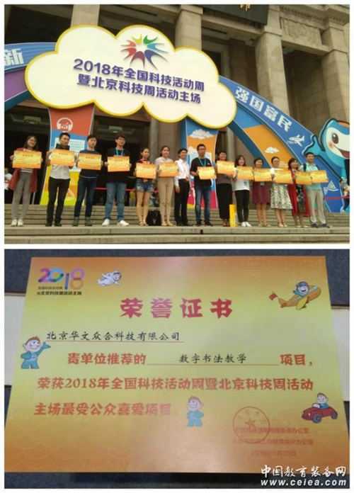 2018年5月26日下午,為期8天的第18屆全國科技活動周暨北京科技周活動在中國人民革命軍事博物館圓滿閉幕。由北京華文眾合科技有限公司展出的“數字書法教室”備受公眾喜愛,獲得了由科技部頒發的 “最受公眾喜愛項目”榮譽。在活動期間華文眾合被科技日報、科技周官方微信、北京時間等媒體采訪報道。