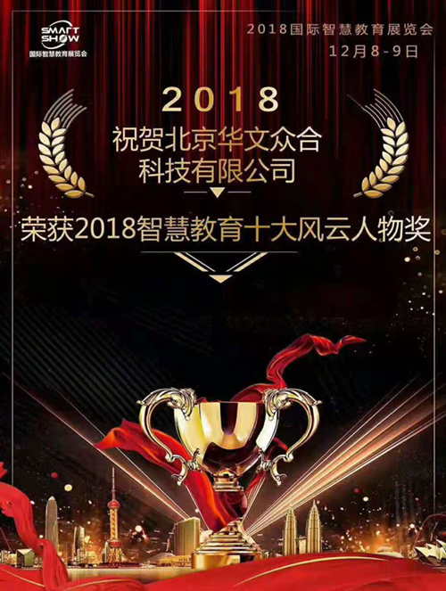 中國國際智慧教育展覽會,繼此前華文眾合獲得“2018校園好方案”優(yōu)秀案例榮譽后,華文眾合總裁向大鳳榮獲2018智慧教育十大風(fēng)云人物獎。