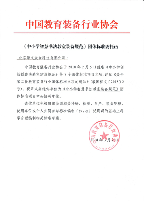 《中小學智慧書法教室裝備規范》團體標準于2018年2月5日批準立項。2018年3月26日,中國教育裝備行業協會發文委托華文眾合為《中小學智慧書法教室裝備規范》團體標準的牽頭制定單位。