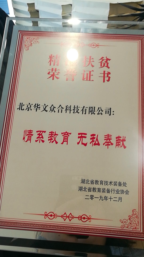 2019年12月,華文眾合給湖北省恩施州巴東縣信陵鎮(zhèn)民族實驗小學(xué)捐贈了一間智慧書法教室,獲得了湖北省教育裝備行業(yè)協(xié)會授予的愛心企業(yè)獎牌。