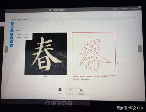 同時,華文眾合智慧書法教室展出了日前推出的“智能課程平臺”,其內容詳實豐富,包含漢字的書寫要點、行筆路線、筆順視圖、筆勢視圖、單鉤視圖、雙鉤視圖、碑帖原圖、碑帖修復圖……對學生認識與掌握漢字的基本信息、間架結構有很大啟發與幫助。