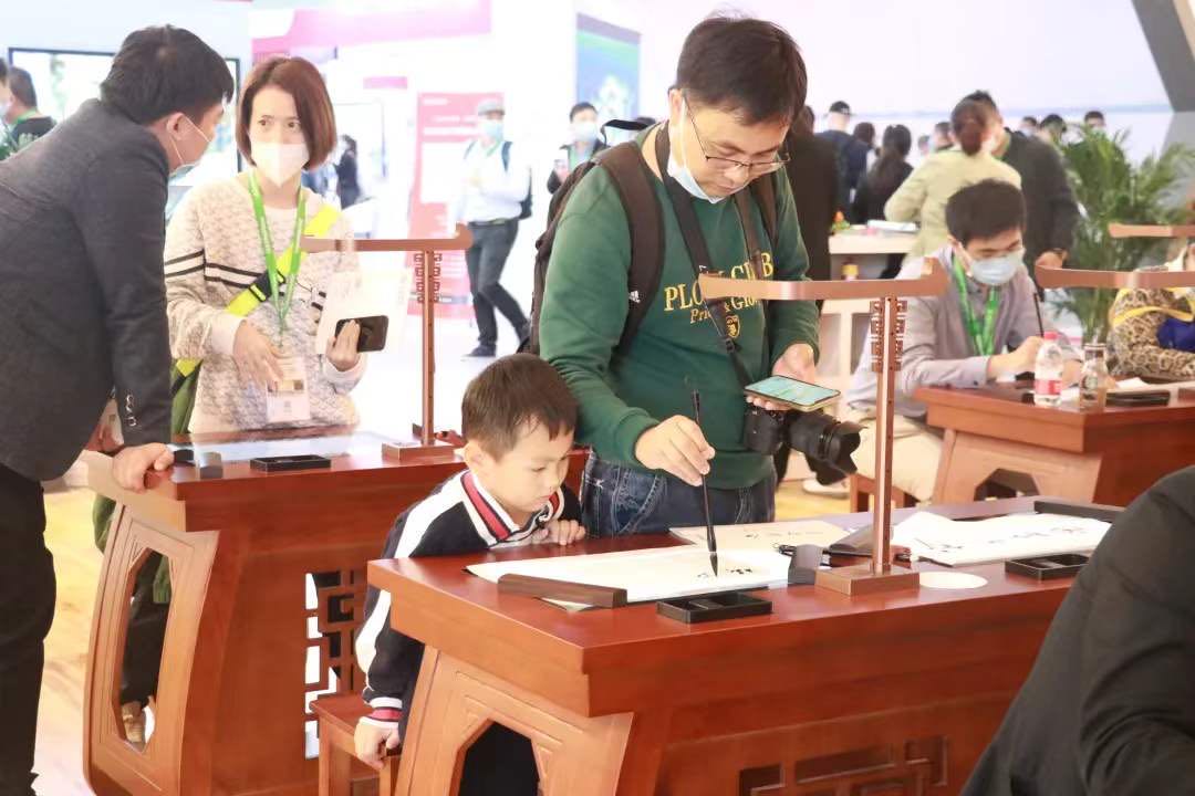 華文眾合展位參觀者認真聽取第七代智慧書法教室講解并參與互動