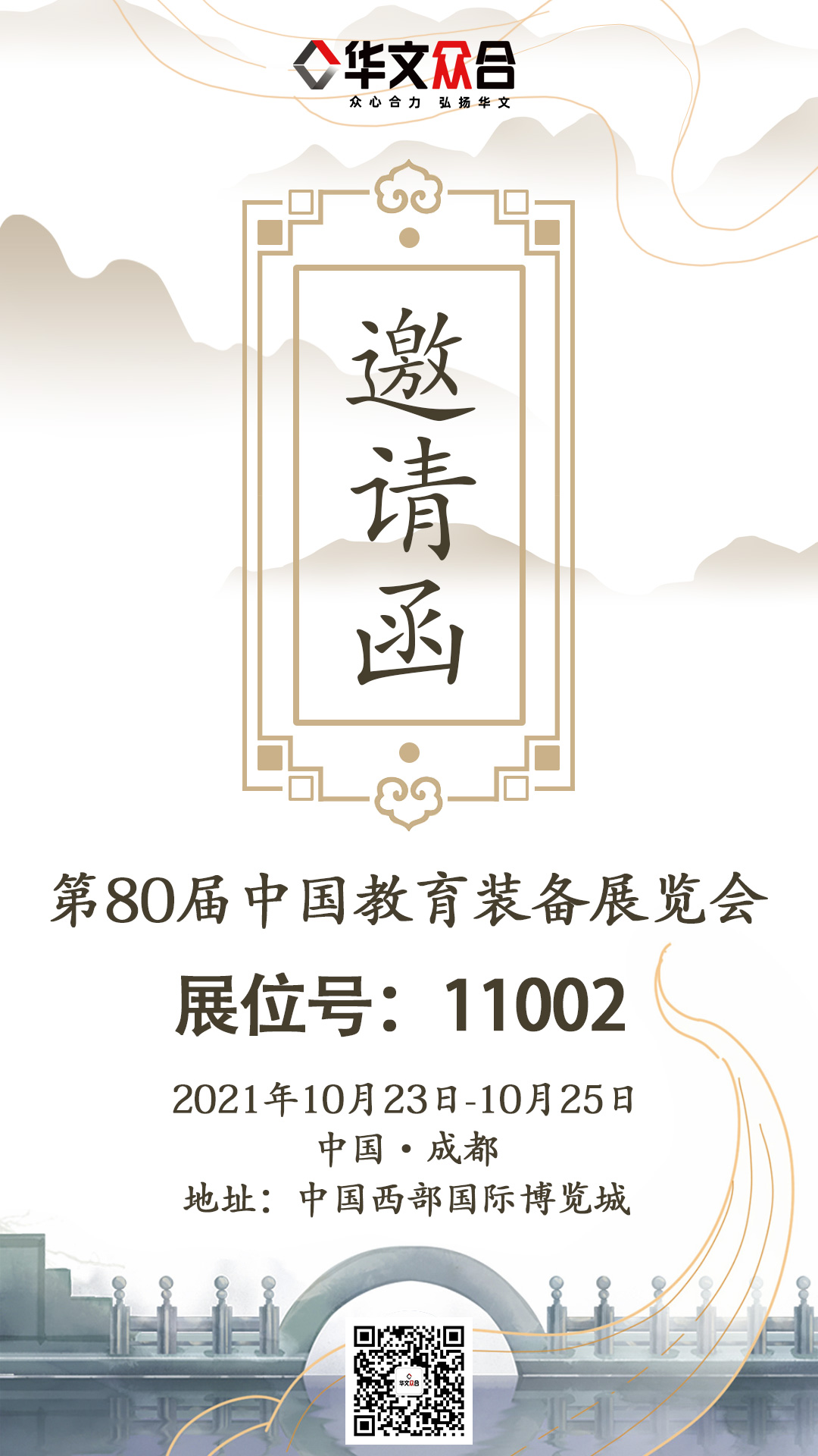 茲定于2021年10月23日一25日在天府之城四川成都-中國西部國際博覽城,舉辦第八十屆中國教育裝備展示會,華文眾合真誠感恩一路走來您給予我們的信任和支持,現真誠邀請您蒞臨華文眾合展位【11號館11002】參觀指導,華文眾合將展現持續創新研發成果,引領行業發展,助力中國書法教育,弘揚中華傳統文化!