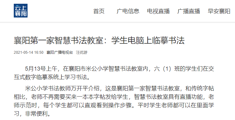 米公小學書法教師萬開平介紹,這是襄陽第一家智慧書法教室,和傳統字帖相比,老師不再需要買來一本本字帖發給學生,智慧書法教室具有直播功能,老師示范時,每個學生都可以直觀看到操作步驟。平時學生老師都可以在里面學習,非常便利。