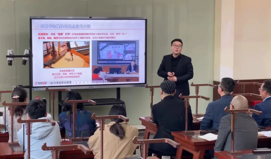 之后的時間里華文眾合的工作人員對華文眾合智慧書法教室做了產品介紹,以智慧書法教室使用技巧及學科融合為主題,介紹了如何用華文眾合智慧書法教室上好一堂書法課,把各個模塊組合起來靈活運用,讓書法課更生動、更形象、更有趣、更有內涵。