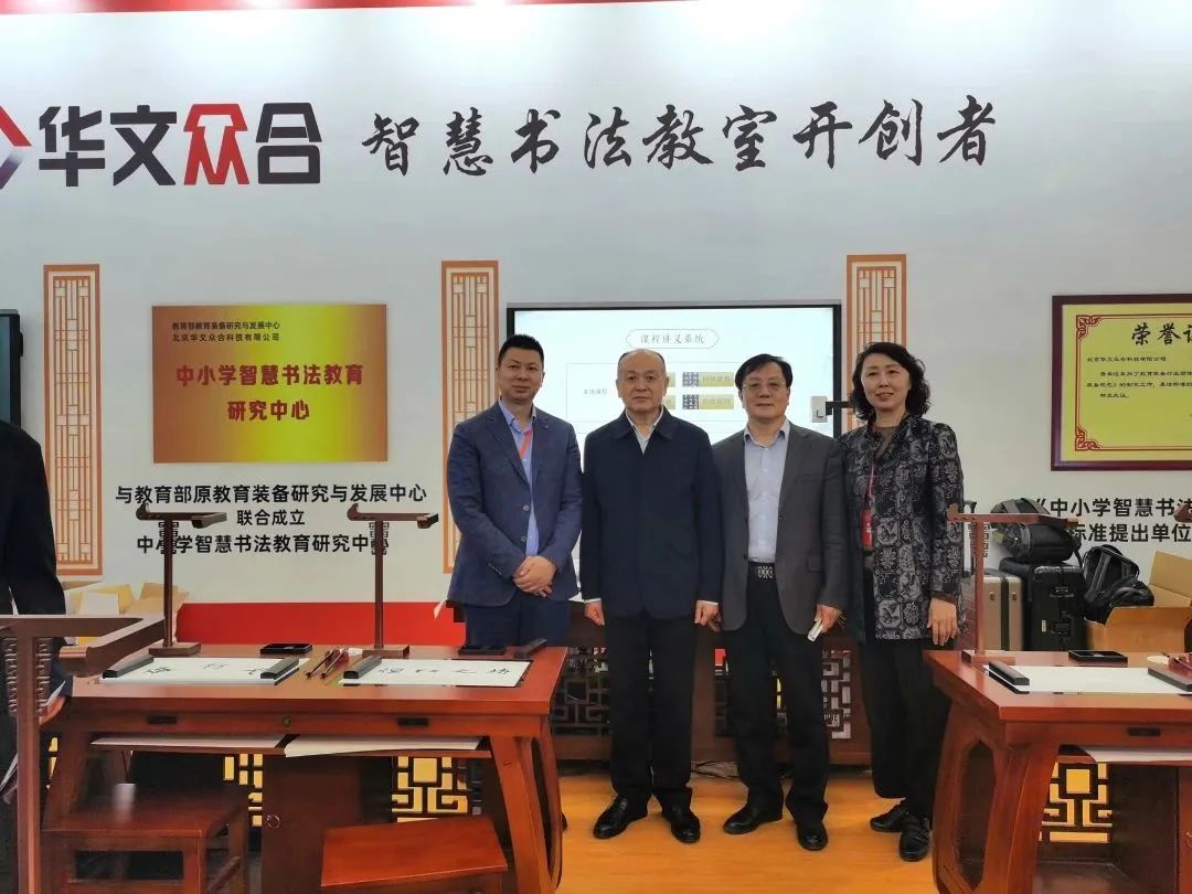 河北省教育裝備行業協會會長郭國維(左二)、河北省教育廳裝備中心主任郭晉寶(右二)、河北省教育裝備行業協會秘書長鄭秋輝(右一)蒞臨華文眾合展位指導