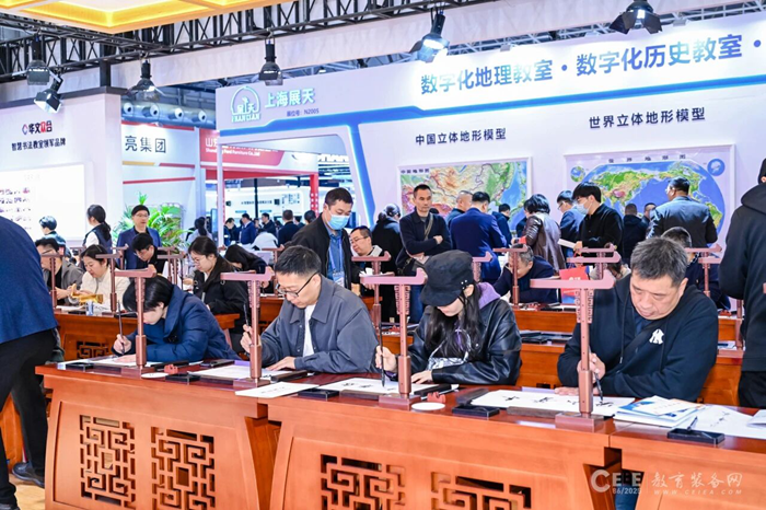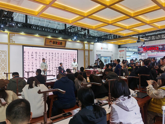 除了華文小奕機器人,華文眾合展位的核心產品第九代智慧書法教室和智慧粉筆教室同樣備受矚目,其傳統與科技的完美結合,引得教育工作者、高校領導及對書法感興趣的社會各界人士紛紛駐足參觀體驗。