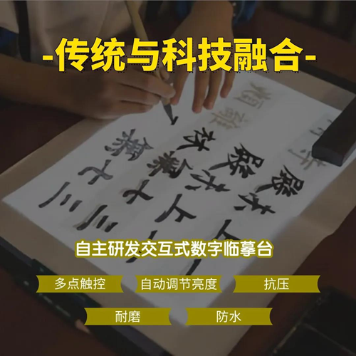 本著弘揚(yáng)傳統(tǒng)文化的初心和“傳統(tǒng)與科技融合,而不摒棄傳統(tǒng)”的理念,華文眾合自主研發(fā)交互式數(shù)字臨摹臺(tái),學(xué)生使用真實(shí)的筆墨紙進(jìn)行學(xué)習(xí),避免水寫、電子模擬等書寫體驗(yàn)對(duì)學(xué)生造成的不良影響。